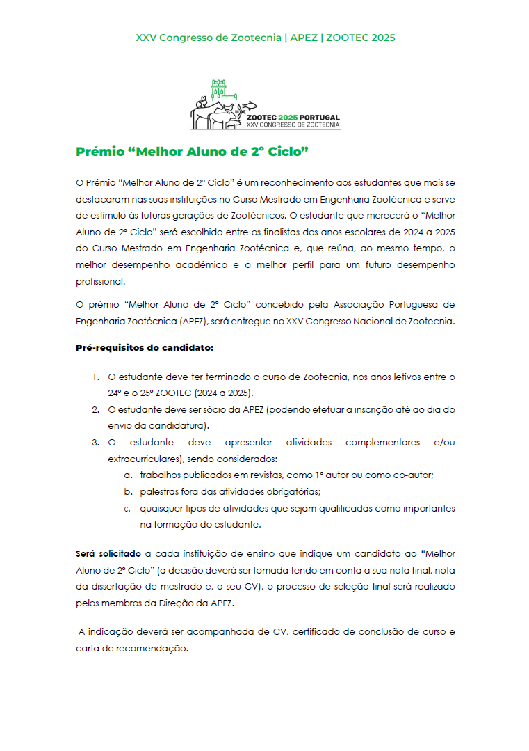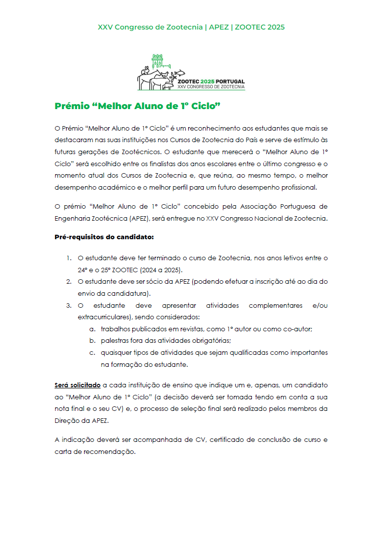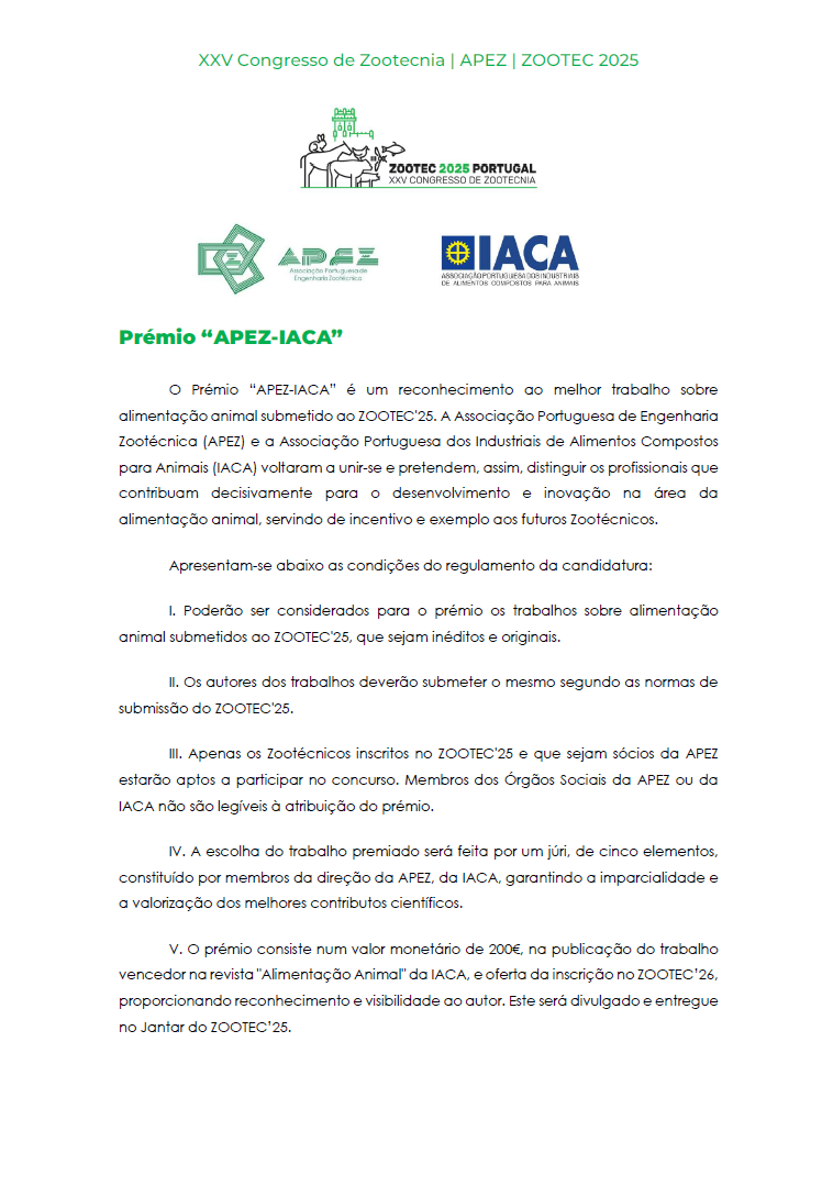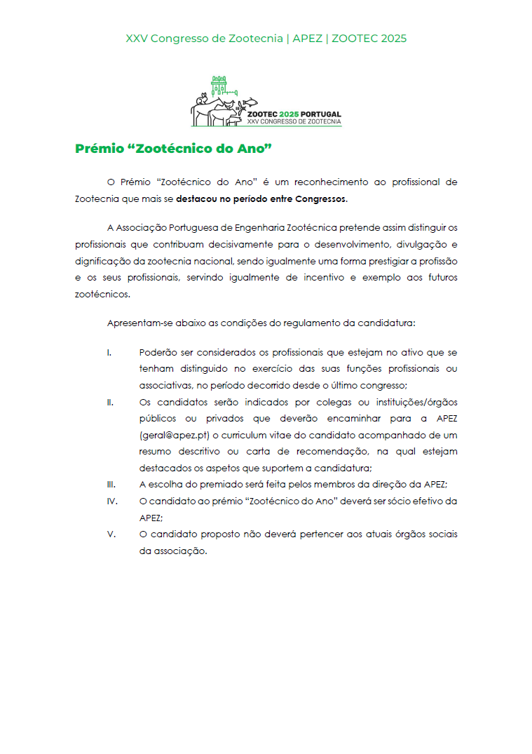 Dia 24 de outubro 9h00 - Sessão V: Saúde e Bem-Estar Animal 11h30 - Intervalo para café e Sessão de Posters 11h30 - Sessão VI: Pastagens, Forragens e Novas Fontes Alimentares – Sessão com o apoio da SPPF 13h00 - Almoço 14h30 - Sessão VII: Produção de Ruminantes 16h15 - Intervalo para café e Sessão de Posters 16h45 - Sessão VIII: Produção de Monogástricos 18h00 - Mesa Redonda 19h30 - Sessão de Encerramento Assinatura de Protocolos de Colaboração Institucional 20h30 - Jantar ZOOTEC’25 (limitado a inscritos) Cerimónia de Entrega de Prémios